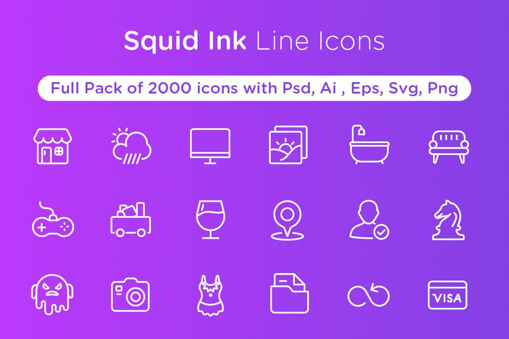 Squid.ink Line Icon Pack offers 2000 handcrafted, consistent and pixel-perfect icons ready to use. Our icons have been specially built to match the current design trends and to help you expand on your projects. This beautiful icons are perfect to create a unique design experience.